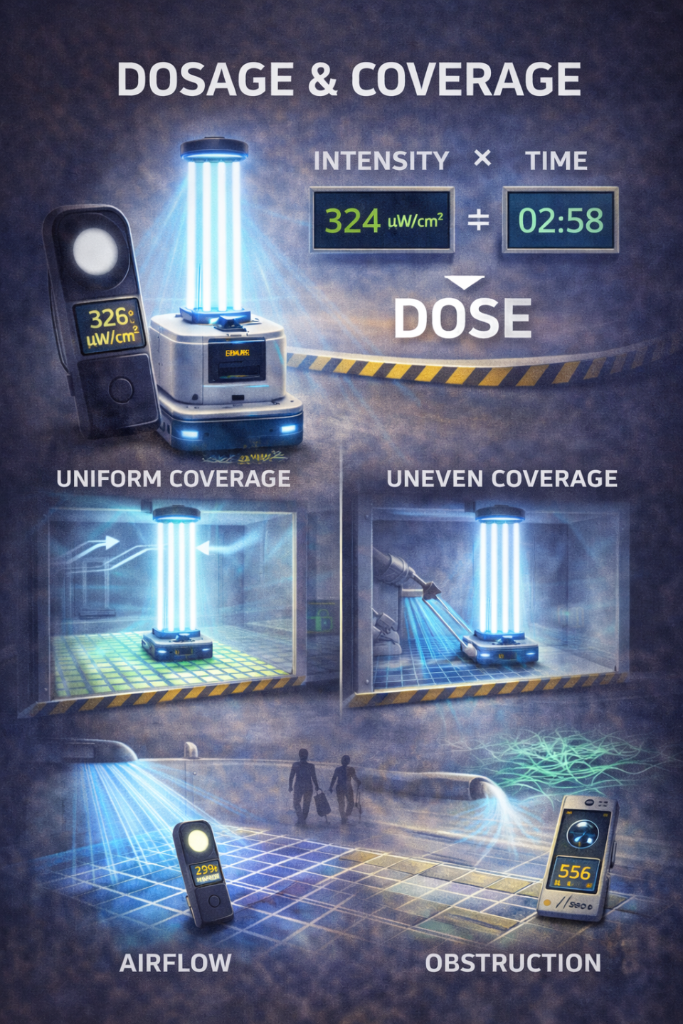 Coverage refers to how uniformly that dose reaches the intended space, surface, air stream, or volume of water. High intensity without sufficient coverage can leave untreated areas. Broad coverage without adequate dose can reduce effectiveness.