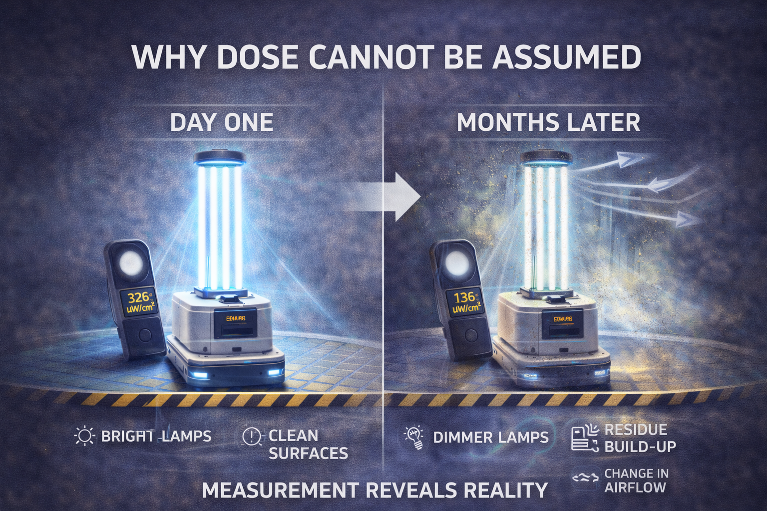 Lamp output changes over time. Surfaces accumulate residue. Airflow patterns shift. Environmental conditions evolve. A system that performs well on day one may perform differently months later if not monitored.