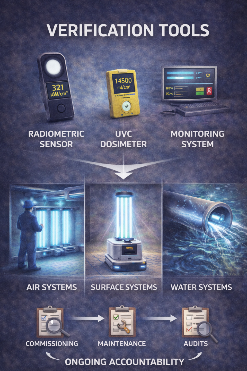 Verification tools are used to confirm that UVC systems are delivering the intended dose within defined safety boundaries.